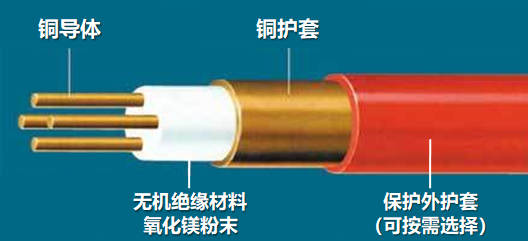 它是一种以 铜护套 包裹铜导体芯线,并以 氧化镁粉末 为无机绝缘材料隔离导体与护套的电缆(也就是说氧化镁绝缘层是在线芯导体与铜护套之间),最外层可按需选择适当外护套。