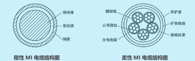 • 按电缆结构可分为【刚性】和【柔性】两种,顾名思义刚性矿物绝缘电缆在施工安装时极难弯曲,而柔性电缆相对较易敷设,它们的结构剖面可看下图:
