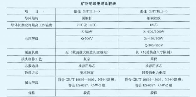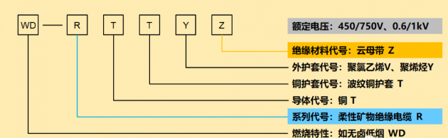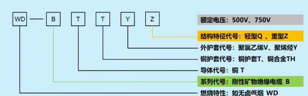 • 刚性矿物绝缘电缆标注为【BTT】型,柔性矿物绝缘电缆标注为【RTT】型。