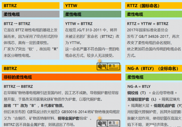 • 其余柔性缆的型号由各个生产厂家自己命名,常见的有BTTRZ、BBTRZ、YTTW、NG-A(BTLY)等总计十几种。