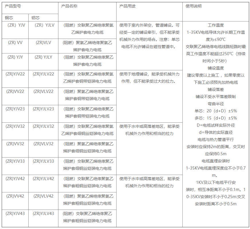 交联聚乙烯绝缘型号:YJV、YJY、YJV22、YJV23、YJV32、YJV33
