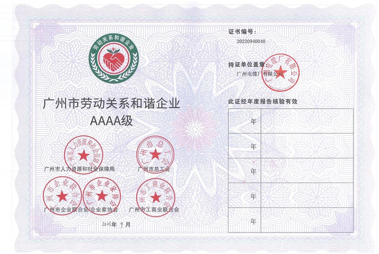 在此之前,广州市劳动关系和谐企业最高级别为AAA级,广州电缆于2020年4月已获得AAA级称号。根据2022年12月起最新修订生效的《广州市创建劳动关系和谐单位评审办法》规定,各等级企业可继续递进评定,因此广州电缆继续升级参评“广州市劳动关系和谐企业AAAA级”企业,并获得评委会认可成功晋级!