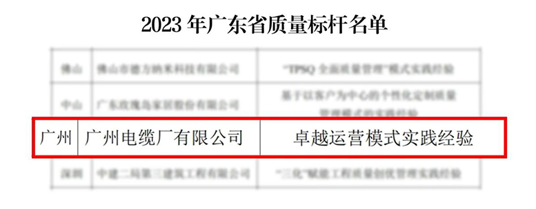 近日,广东省质量协会公布“2023年广东省质量标杆”名单,广州电缆凭借“卓越运营模式实践经验”成功入选,成为广东省唯一获此殊荣的电线电缆企业。