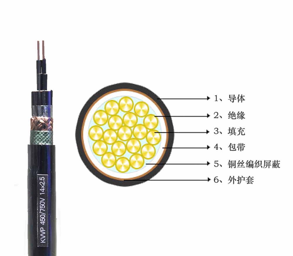 字母含义:K:控制电缆系列代号;V:聚氯乙烯绝缘;V:聚氯乙烯护套;P:编织屏蔽